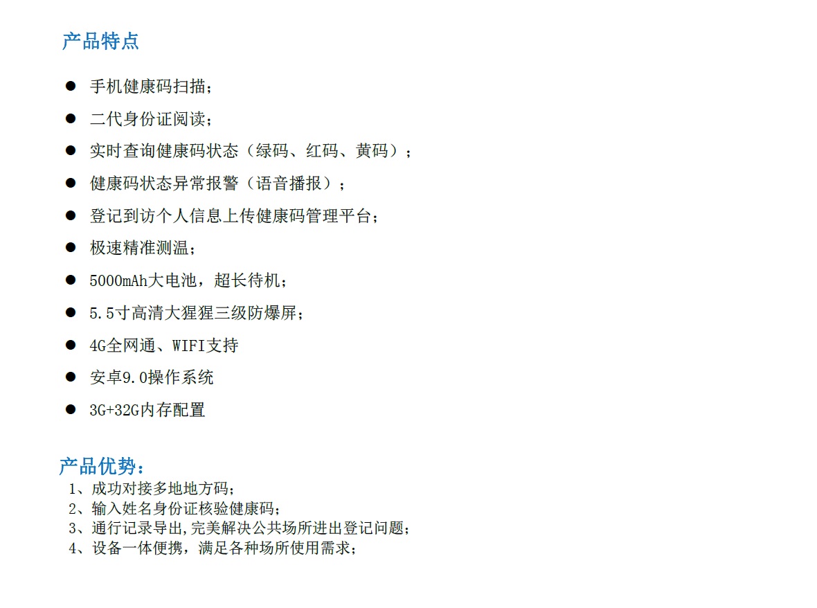 手機健康碼掃描; 二代身份證閱讀; 實時查詢健康碼狀態(tài)(綠碼、紅碼、黃碼); 健康碼狀態(tài)異常報警(語音播報); 登記到訪個人信息上傳健康碼管理平臺; ? 極速精準測溫...